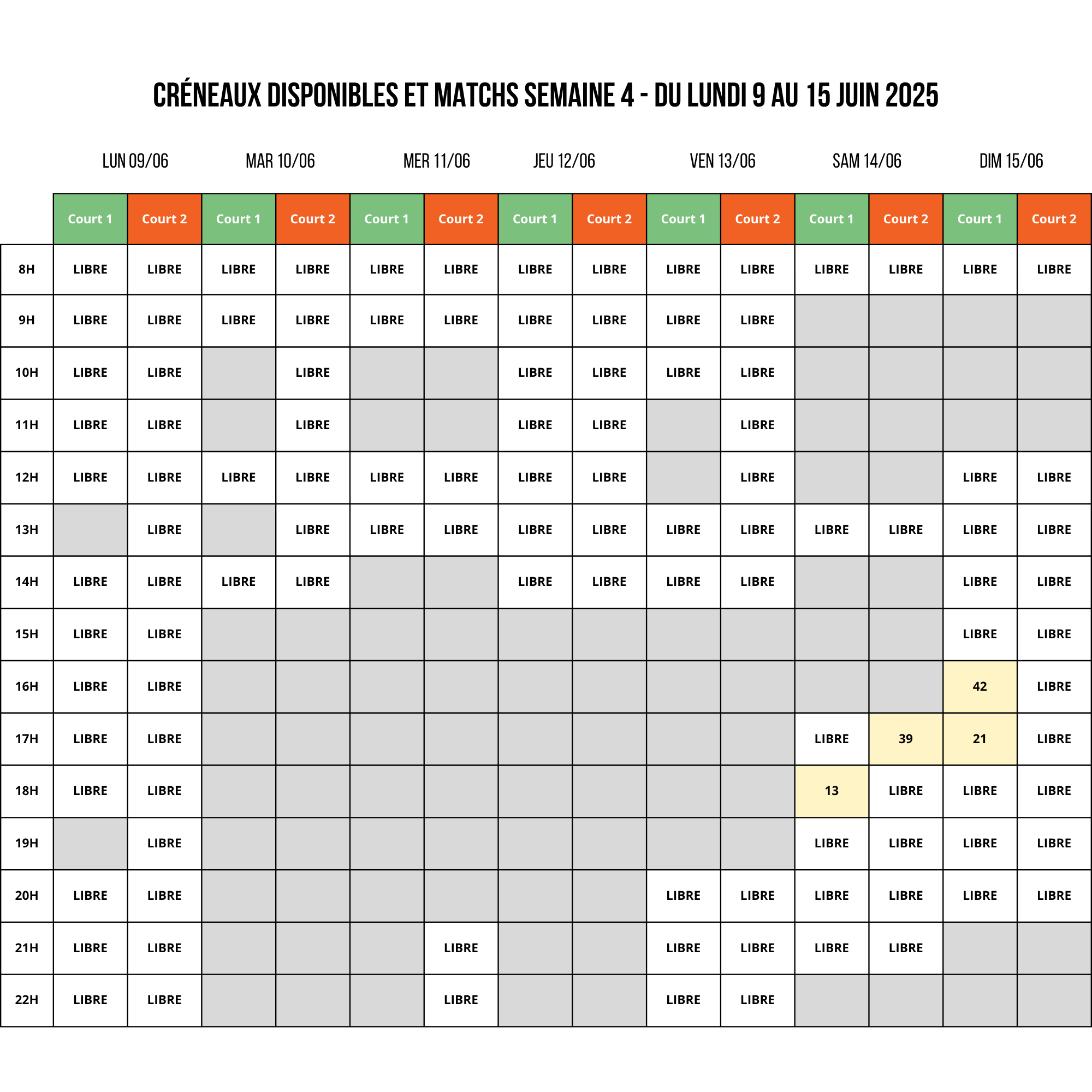 Matchs la semaine en soirée en fonction des dispos mais essentiellement en weekend (vendredi soir, samedi après-midi et dimanche après-midi).